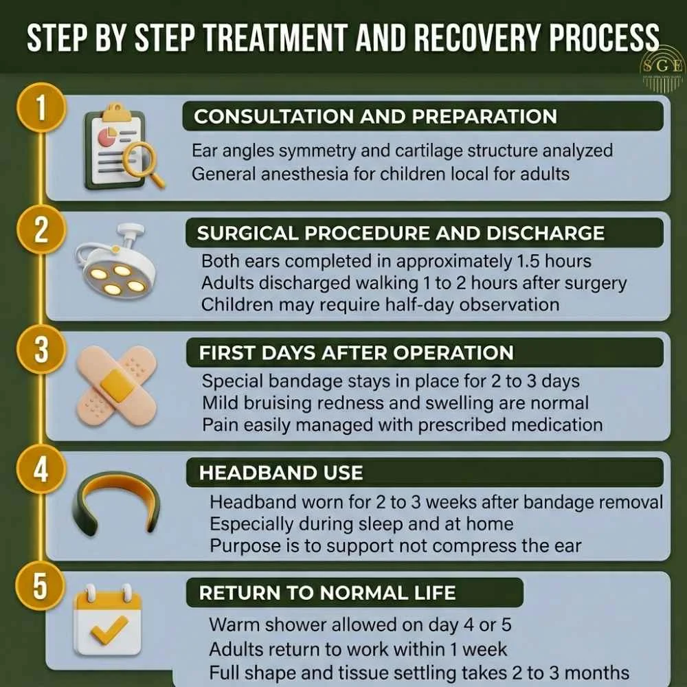 2. Surgical Intervention and Discharge: During an operation performed under local anesthesia, the patient feels no pain, only touches. The procedure takes a total of about 1.5 hours for both ears. At the end of the surgery, a protective and compressive dressing bandage is applied over the ears. Adult patients can walk out of the hospital or clinic and return home 1-2 hours after the operation. Child patients may require half a day of observation for monitoring purposes.
