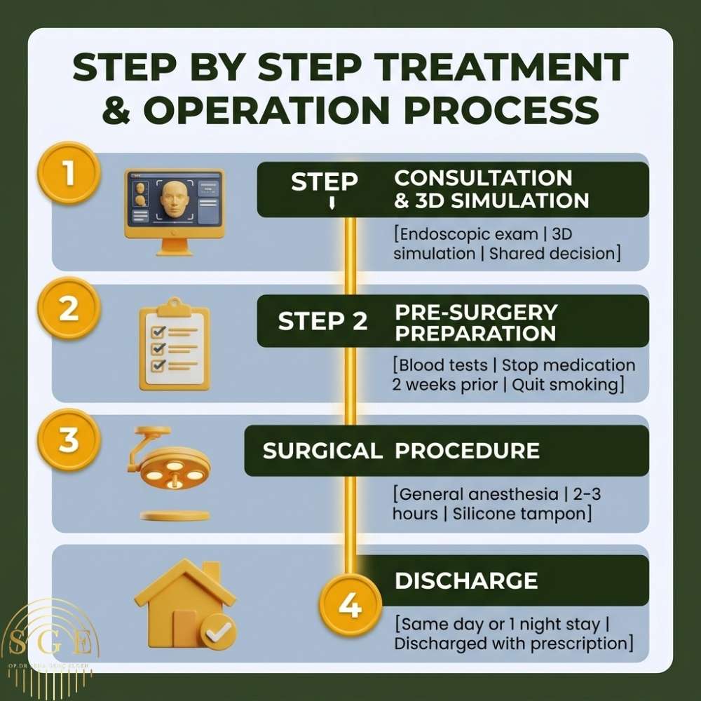 3. Surgical Intervention and Hospital Stay: The operation is performed in fully equipped hospital conditions, accompanied by an expert anesthesia team, and under general anesthesia. Depending on the scope of the planned procedure (aesthetic only, or including functional repair), the surgery takes an average of 2 to 3 hours. At the end of the procedure, a thermal splint is placed on the outside to protect the nasal structure, and modern silicone sheet splints with air channels, which do not stick and allow the patient to breathe as soon as they wake up, are placed inside. Old-generation cloth tampons are absolutely no longer used.